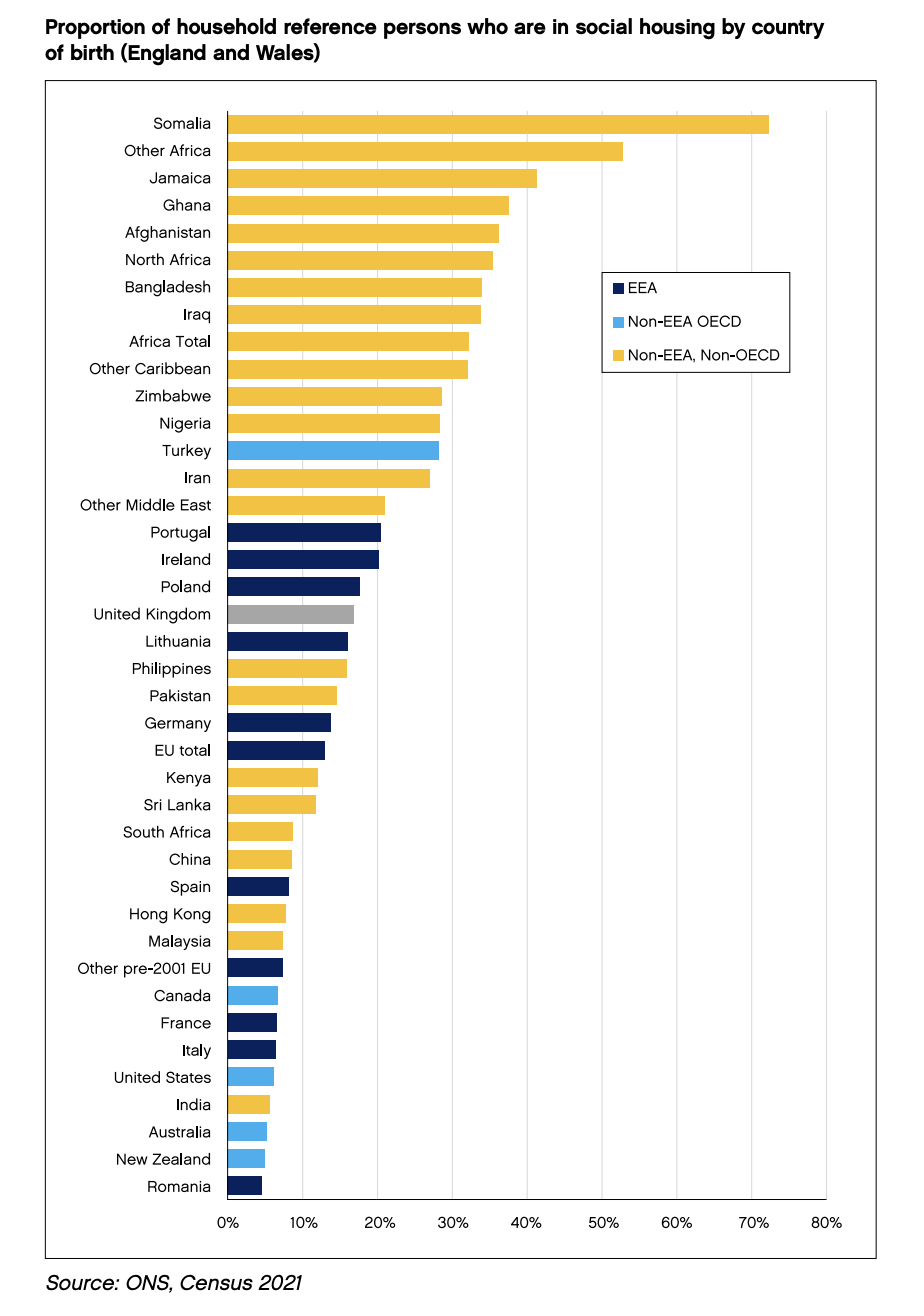 A rational migration policy might have looked to have stricter criteria for those looking to migrate from Somalia, Jamaica, or Ghana than those from Australia, New Zealand, or Romania (social housing rate <6%).
